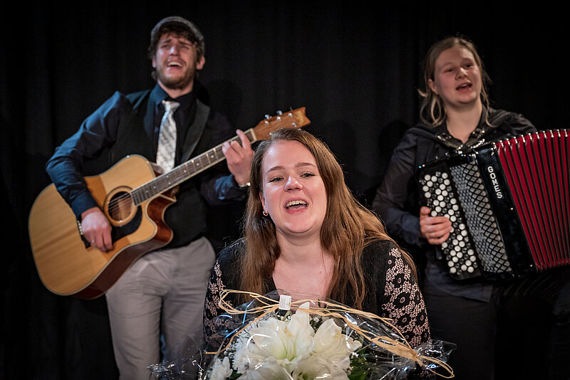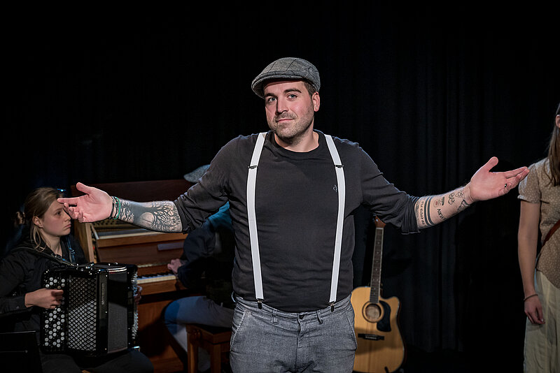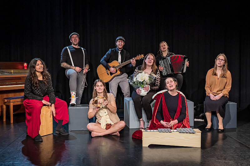 Lisa Ray, Dozentin, und Joscha Schraff, Dozent und Musiker, begleiteten die spielfreudigen Studierenden. Jürg Schneckenburger Dozent und Theaterpädagoge hat die Prosavorlage von Peter Bichsel bearbeitet und bedankt sich mit diesen Zeilen von Herzen bei den spielenden Studierenden für die intensive, lustvolle Zusammenarbeit und ihre berührenden Figuren.